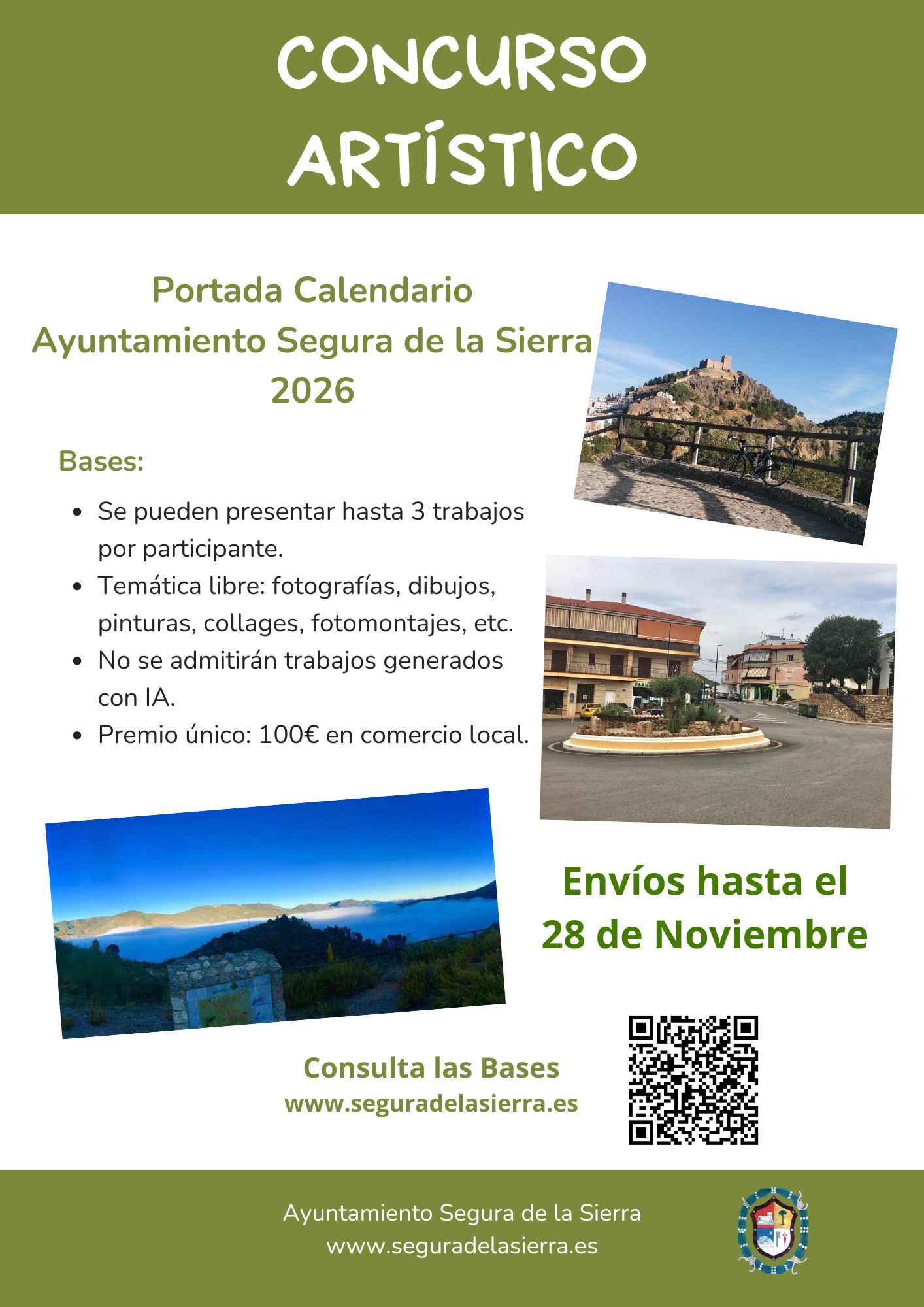 Este 2025 el Ayuntamiento de Segura de la Sierra organiza un concurso destinado a ilustrar el calendario municipal para 2026. El concurso admitirá todo tipo de expresiones artísticas adecuadas para ilustrar dicho calendario, sea fotografía, fotomontajes, collages, dibujos, pintura, etc, siempre que sean originales y no se hayan utilizado herramientas IA para su generación. El concurso constará de una única categoría destinada a trabajos relacionados con nuestro municipio. El premio será de 100€ a gastar en los comercios locales.