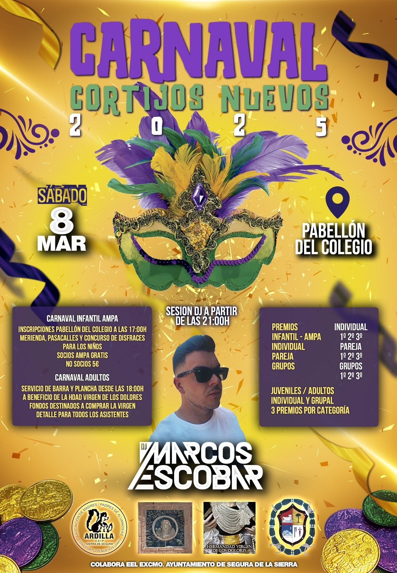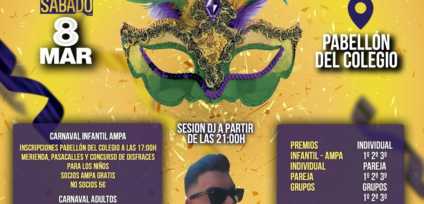 El Sábado 8 de marzo se celebra la fiesta de Carnaval en Cortijos Nuevos. Habrá detalles para todos los asistentes, concurso de disfraces para infantil y adultos, sesión DJ Marcos Escobar y Barra a beneficio del “Viernes de Dolores”.