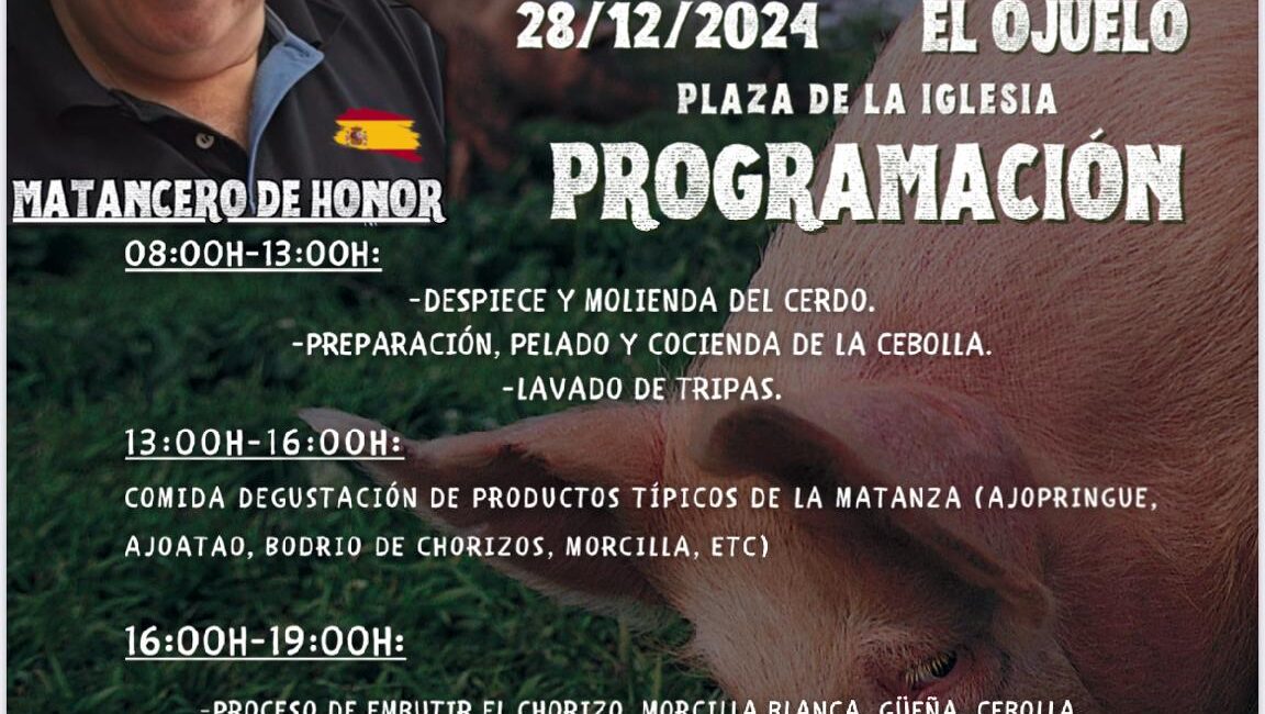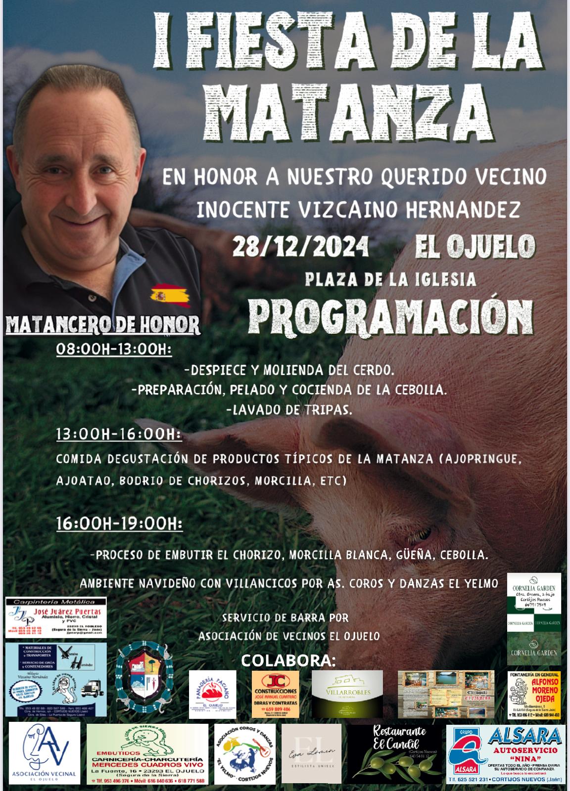 La Asociación de Vecinos de El Ojuelo organiza la Fiesta de la Matanza el próximo día 28 de diciembre de 2024 en la plaza de la Iglesia de El Ojuelo. Esta fiesta, que en esta primera edición esta dedicada a Inocente Vizcaíno, cuenta con la colaboración de numerosas asociaciones y empresas locales.