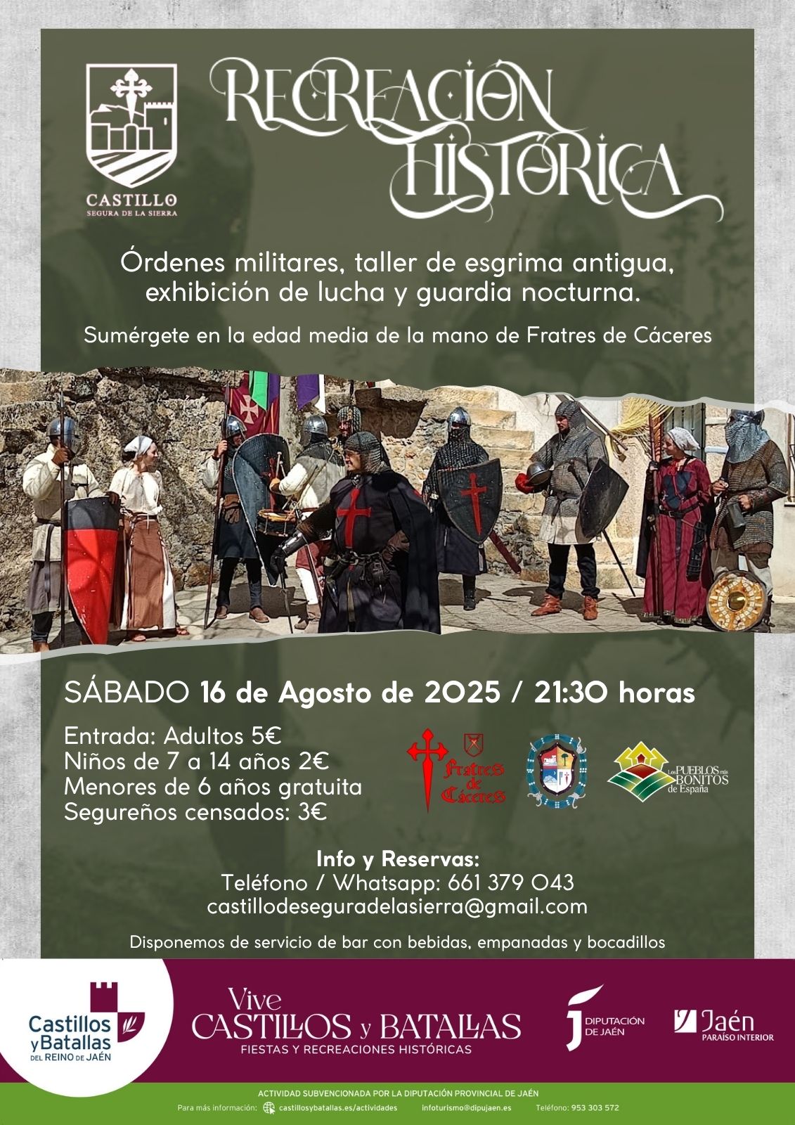 El próximo 16 de agosto a las 21:30 horas y dentro del programa Vive los Castillos y Batallas, Fratres de Cáceres visitarán el Castillo de Segura de la Sierra acercándonos el mundo de las órdenes militares medievales. Podremos conocer en primera persona su funcionamiento, nociones básicas de esgrima antigua, asistir a una exhibición de combate y una guardia nocturna por el castillo.