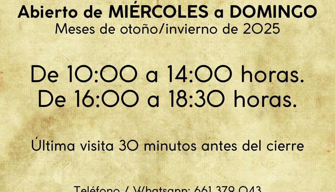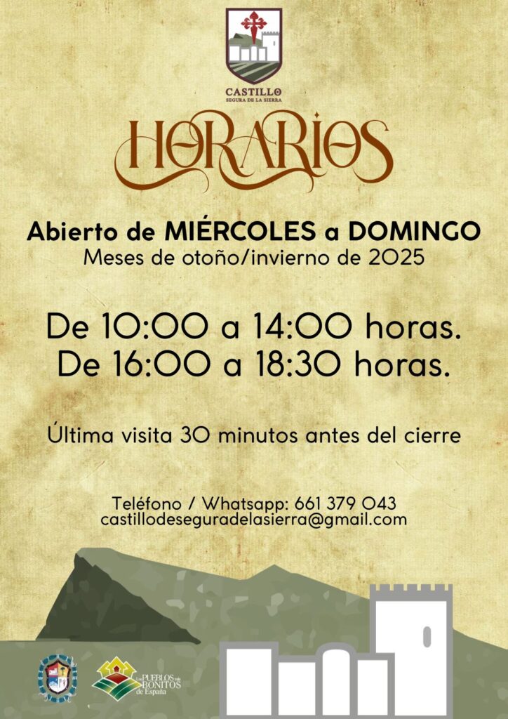 Horarios actualizados del Castillo de Segura de la Sierra para este otoño/invierno. La oficina de turismo permanecerá cerrada hasta nuevo aviso.