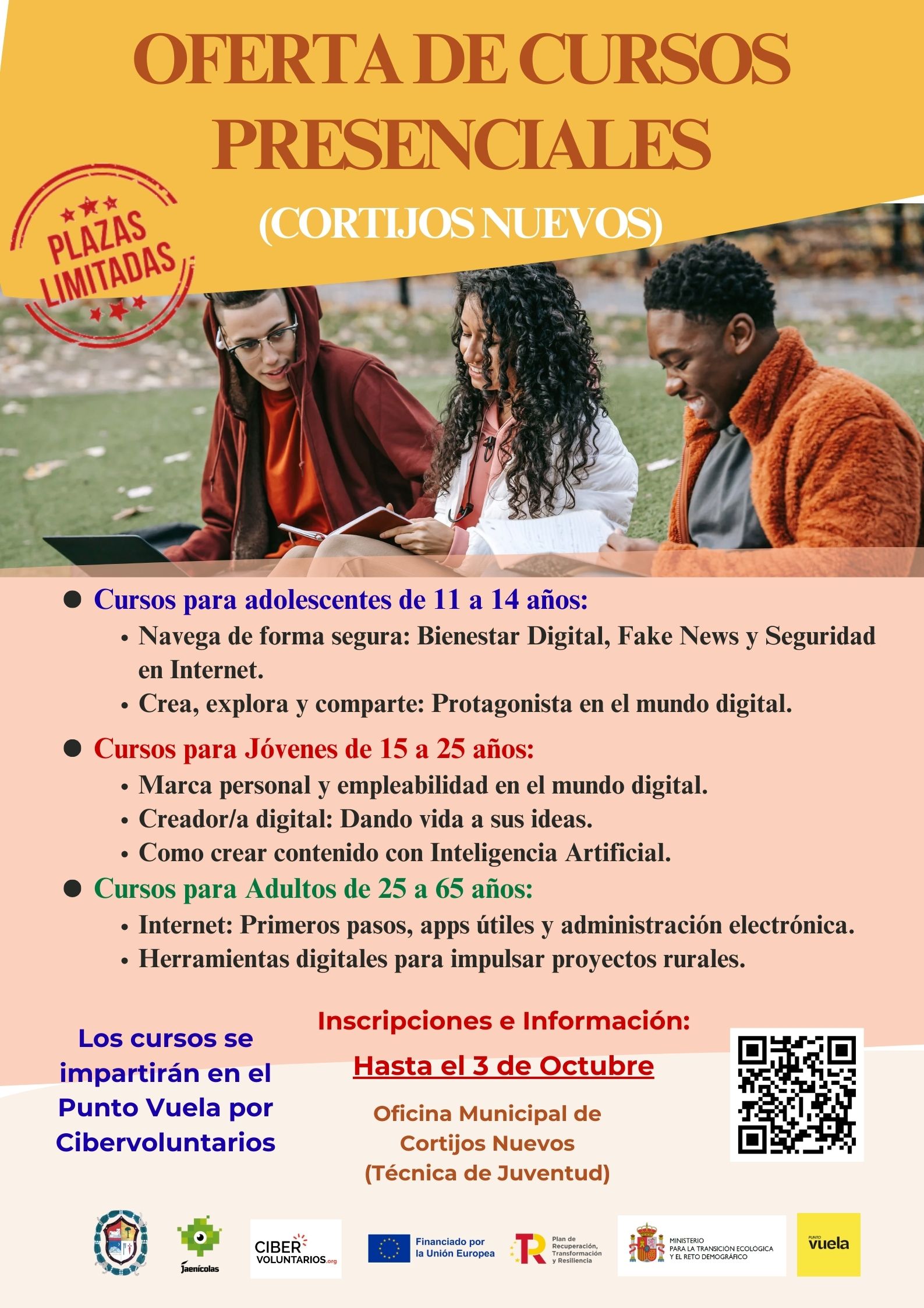 Pueden inscribirse hasta el día 3 de octubre en el siguiente formulario o contactando con la oficina municipal de Cortijos Nuevos. https://forms.gle/KRTwtSC1t4iS22ib8
