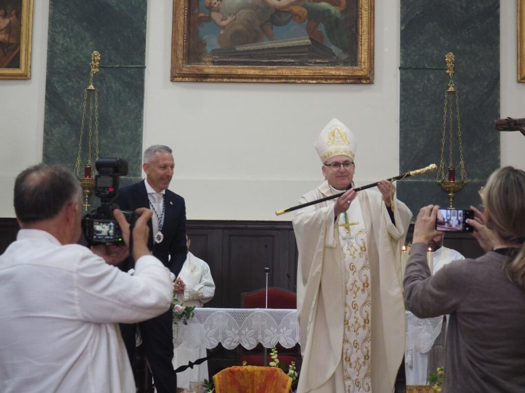 Tras la lectura del acta, el párroco dio lectura al decreto de nuestro Obispo, de fecha 24 de noviembre de 2025, con el cual ratificaba el acuerdo plenario del Ayuntamiento. Tras la lectura, todos los asistentes rompieron en un aplauso mientras el alcalde entregaba el bastón al Obispo y, una vez devuelto nuevamente al alcalde, lo imponía a la Virgen. Justo al terminar este momento, las campanas sonaban como todos los días a las 12:00.